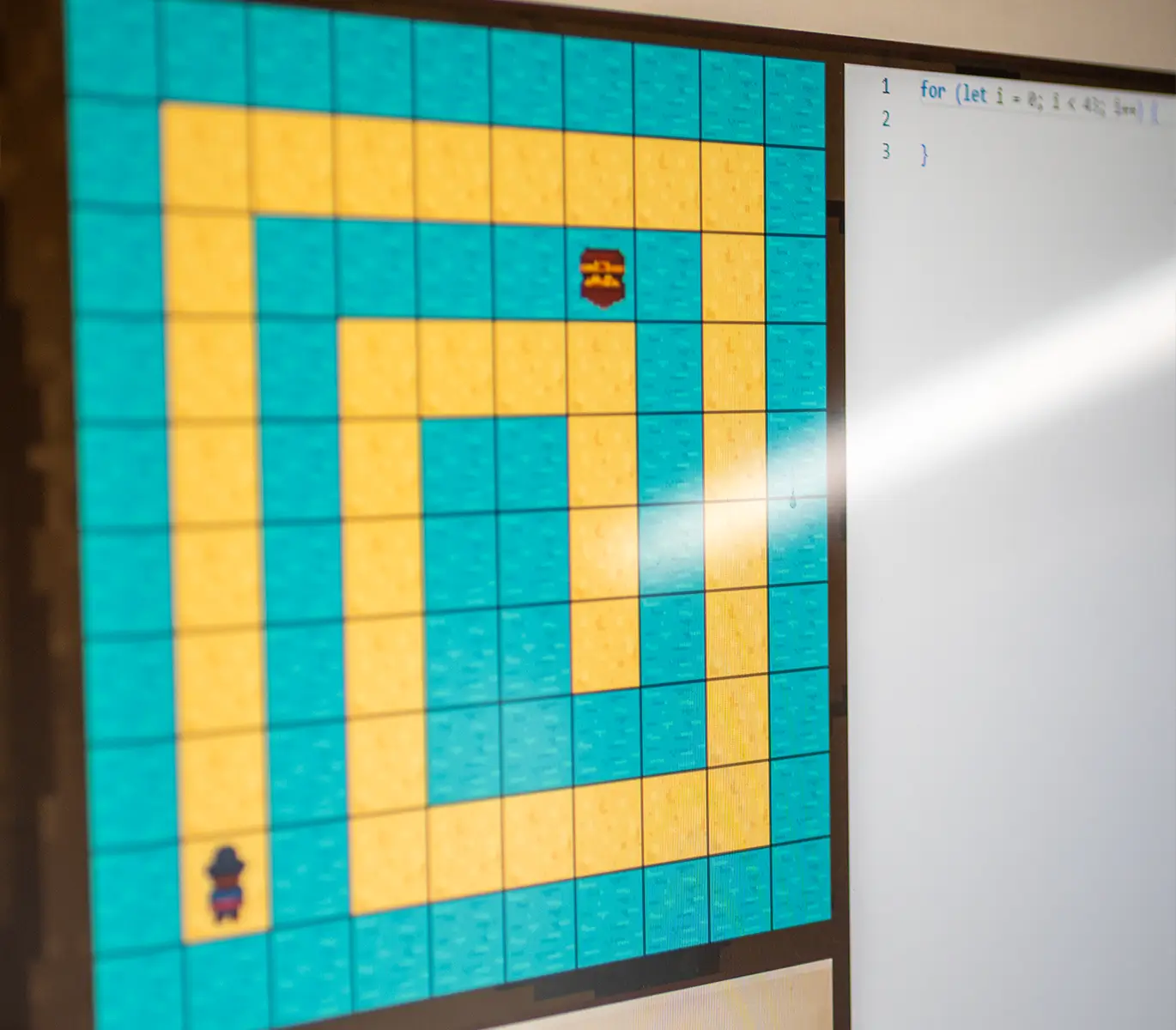 Entwicklung eines Spiels in reinem JavaScript, bei dem eine Figur direkt durch Code-Eingaben gesteuert wird. Mit einem eigenen, reaktiven Renderers, der alle Zustandsänderungen und Aktionen dynamisch auf dem HTML-Canvas darstellt